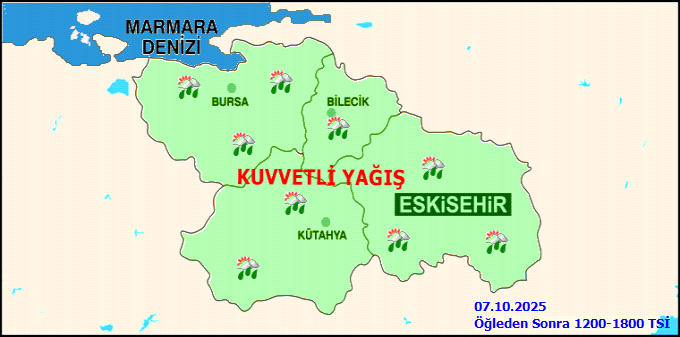 Rüzgarın güney yönlerden orta kuvvette eseceği tahmin edilirken, Bursa ve Kütahya’da sağanak yağışların kuvvetli 21-50 km/m2 olması beklendiği için sel, su baskını ve yağış anında kuvvetli rüzgar gibi olumsuzluklara karşı dikkatli ve tedbirli olunması konusunda uyarıda bulunuldu.